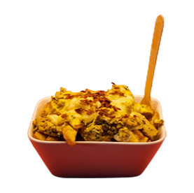 3 Viandes au choix, frites, sauce fromagère, crudités, mozzarella.